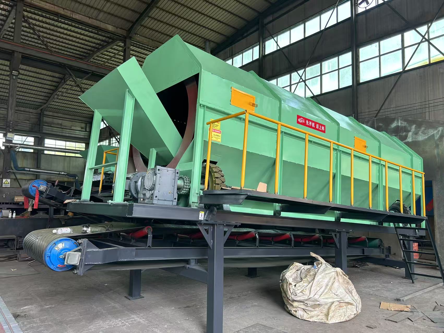 無軸滾筒篩是通過長(zhǎng)鼓的孔尺寸來分類廢物。不同尺寸的孔分選不同類型的材料(對(duì)沙子,碎玻璃,陶瓷和石材等惰性小于80mm,可回收塑料為80mm至200mm,紙和大塑料為200mm至300mm)。各個(gè)零件分別具有比篩網(wǎng)孔的直徑小的尺寸的零件落到機(jī)器的底部,尺寸大于篩網(wǎng)直徑的零件在機(jī)器的上方向前移動(dòng),運(yùn)動(dòng)時(shí),沿出入方向落入排料斗,排向周圍環(huán)境較好。